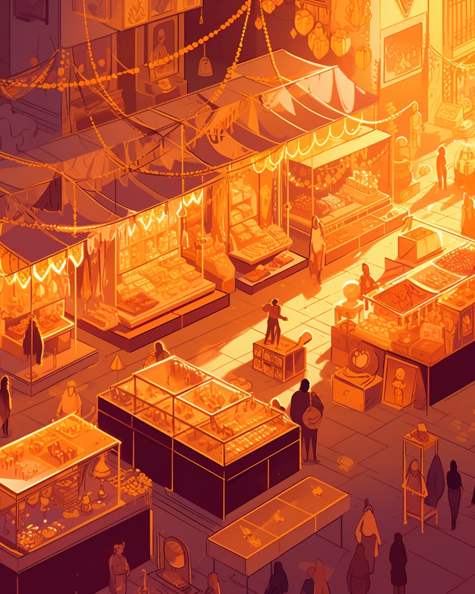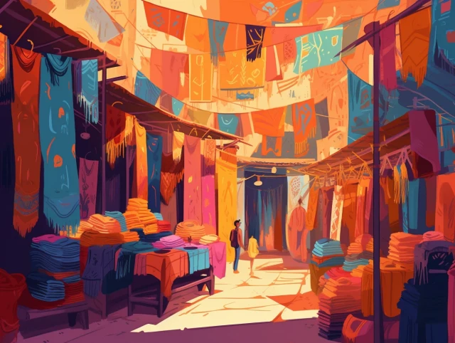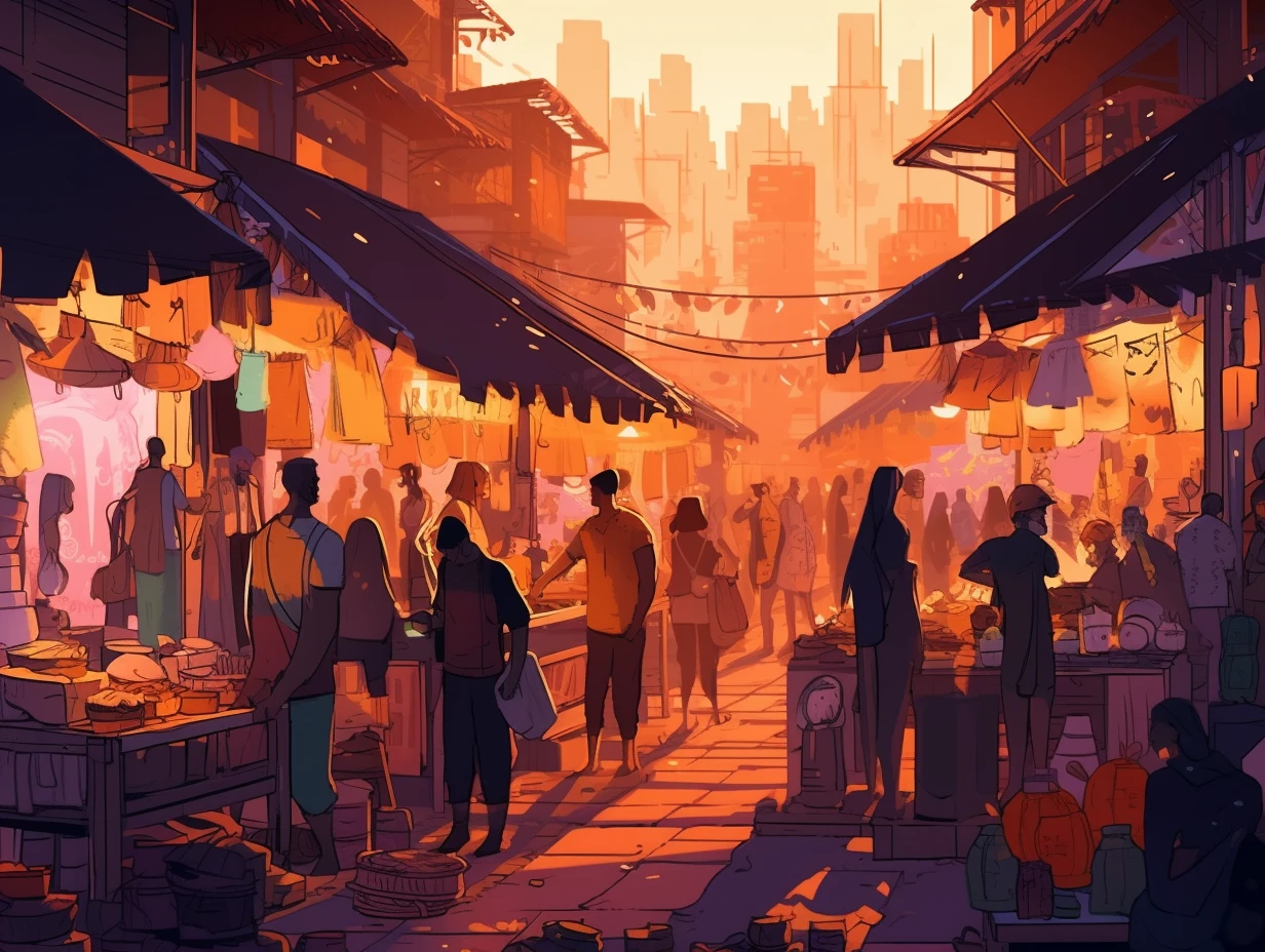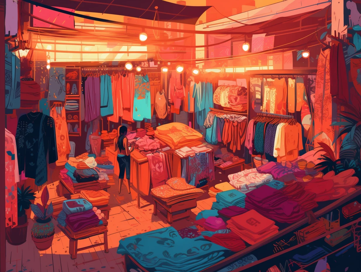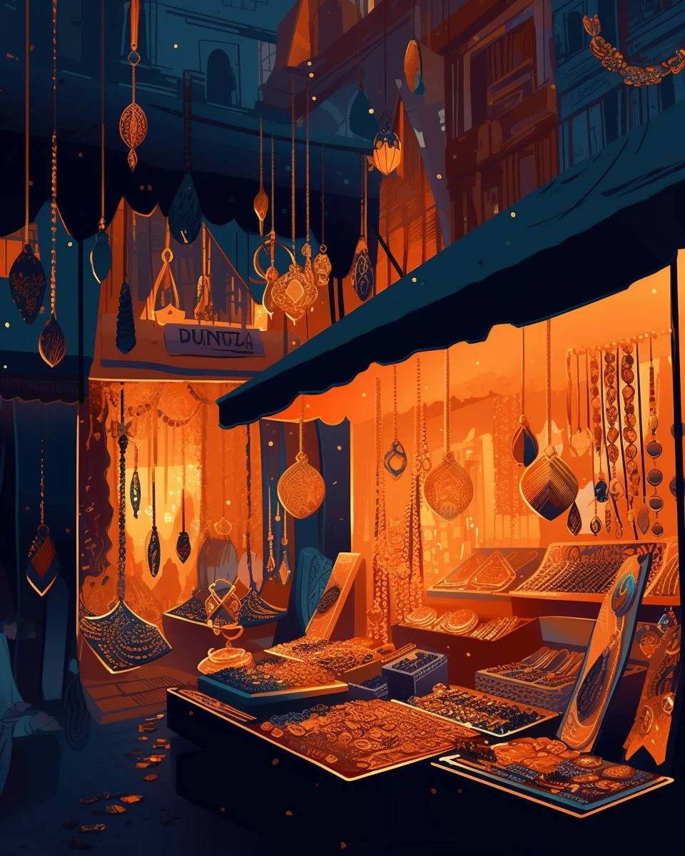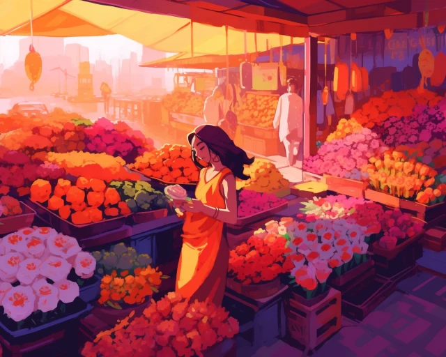 The air is thick with the aroma of spices, fresh fruits, and flowers, and the sounds of vendors hawking their wares blend together in a lively cacophony. The stalls are adorned with vibrant textiles and trinkets, and each vendor competes to attract customers with their unique offerings. Shoppers can find anything from handcrafted jewelry and ornate textiles to fresh produce and exotic spices. The marketplace is a hub of activity, with locals and tourists alike browsing and haggling for the best deals.