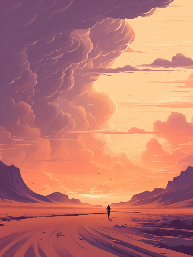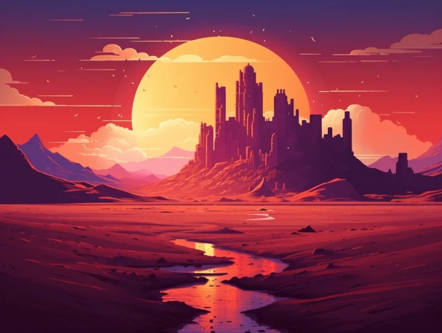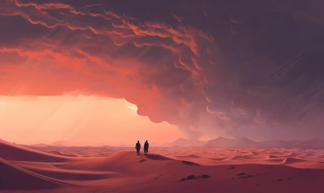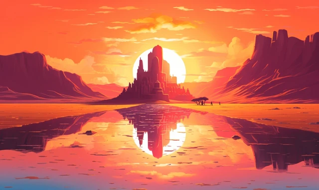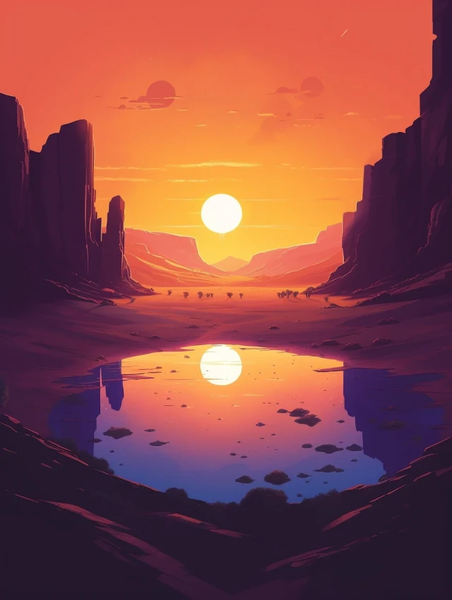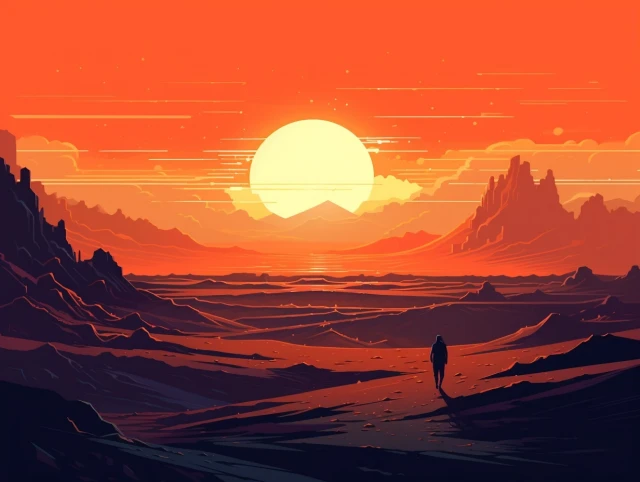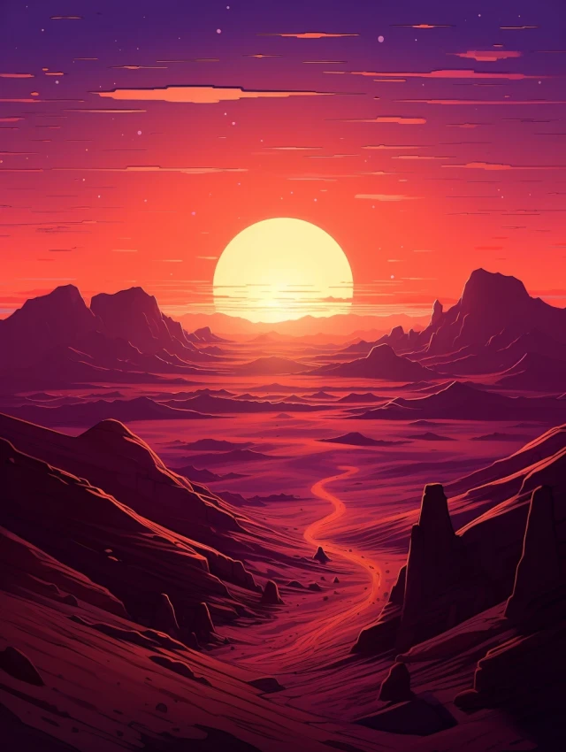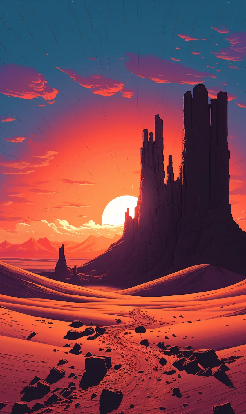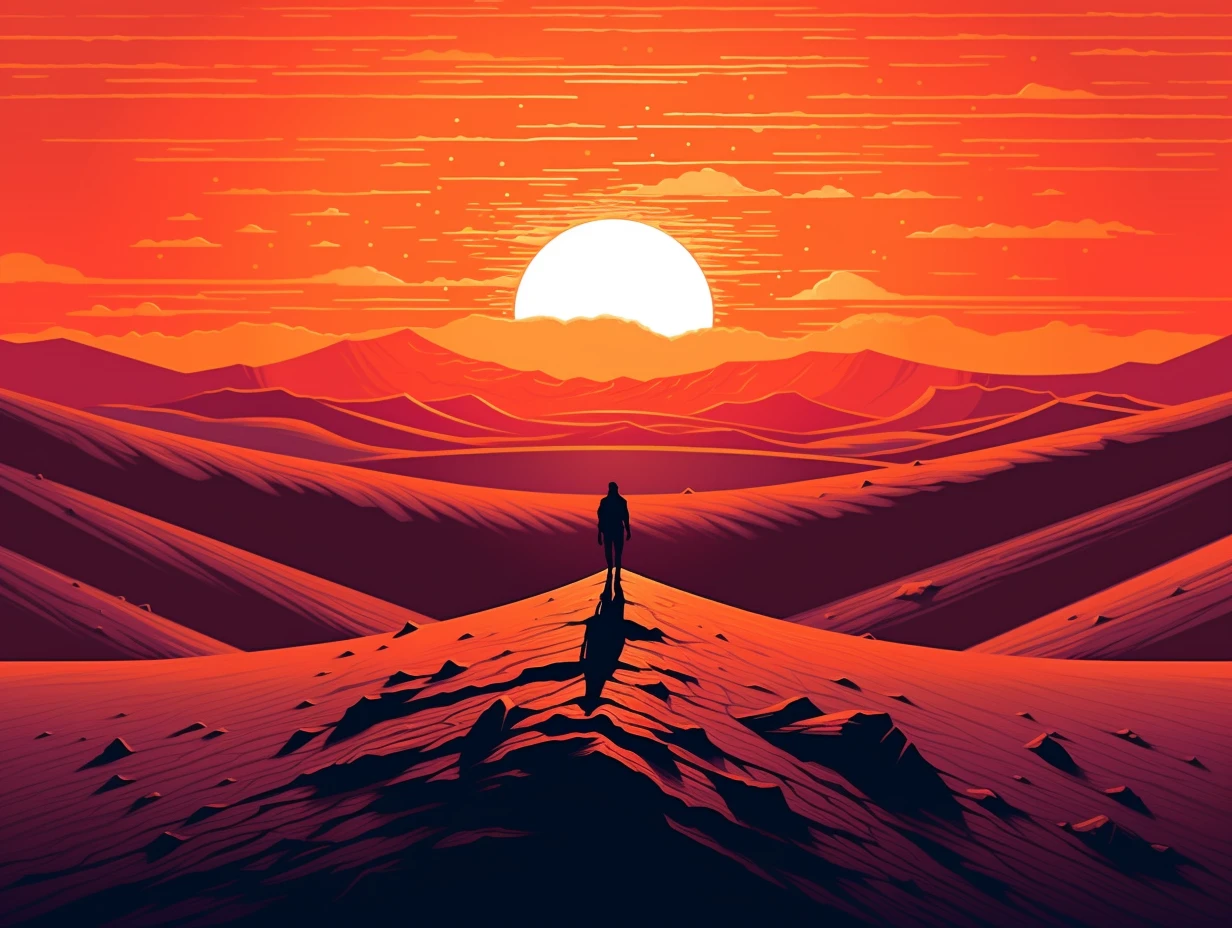 The relentless sun casts an intense glow over a stunning and unforgiving landscape. Towering sand dunes rise like colossal waves, their golden peaks shimmering under the blazing sun. This evocative scene captures the harsh beauty and unyielding spirit of the desert, where nature's extremes paint a mesmerizing canvas of contrasts, inviting adventurers to explore its secrets and challenges.